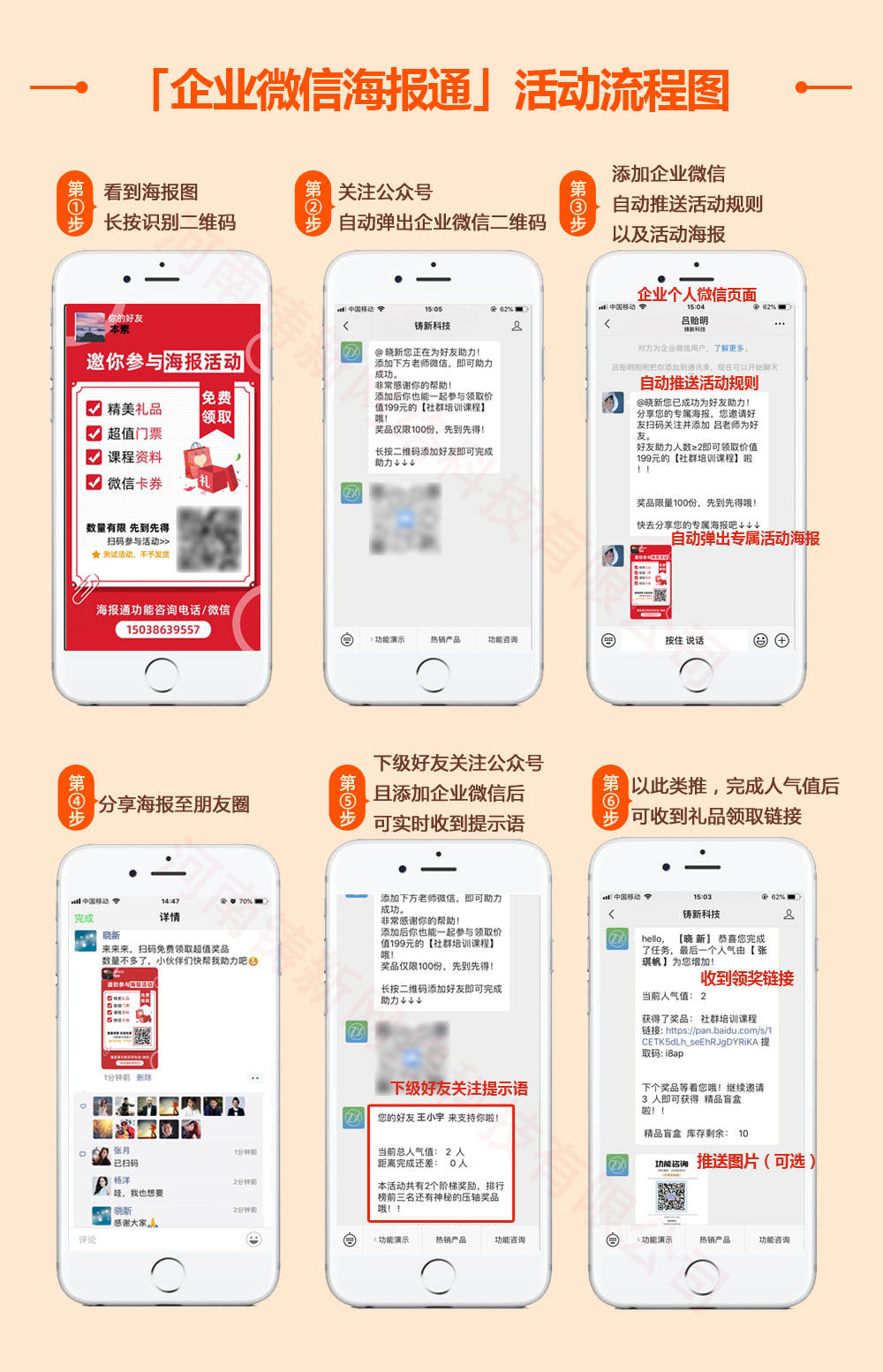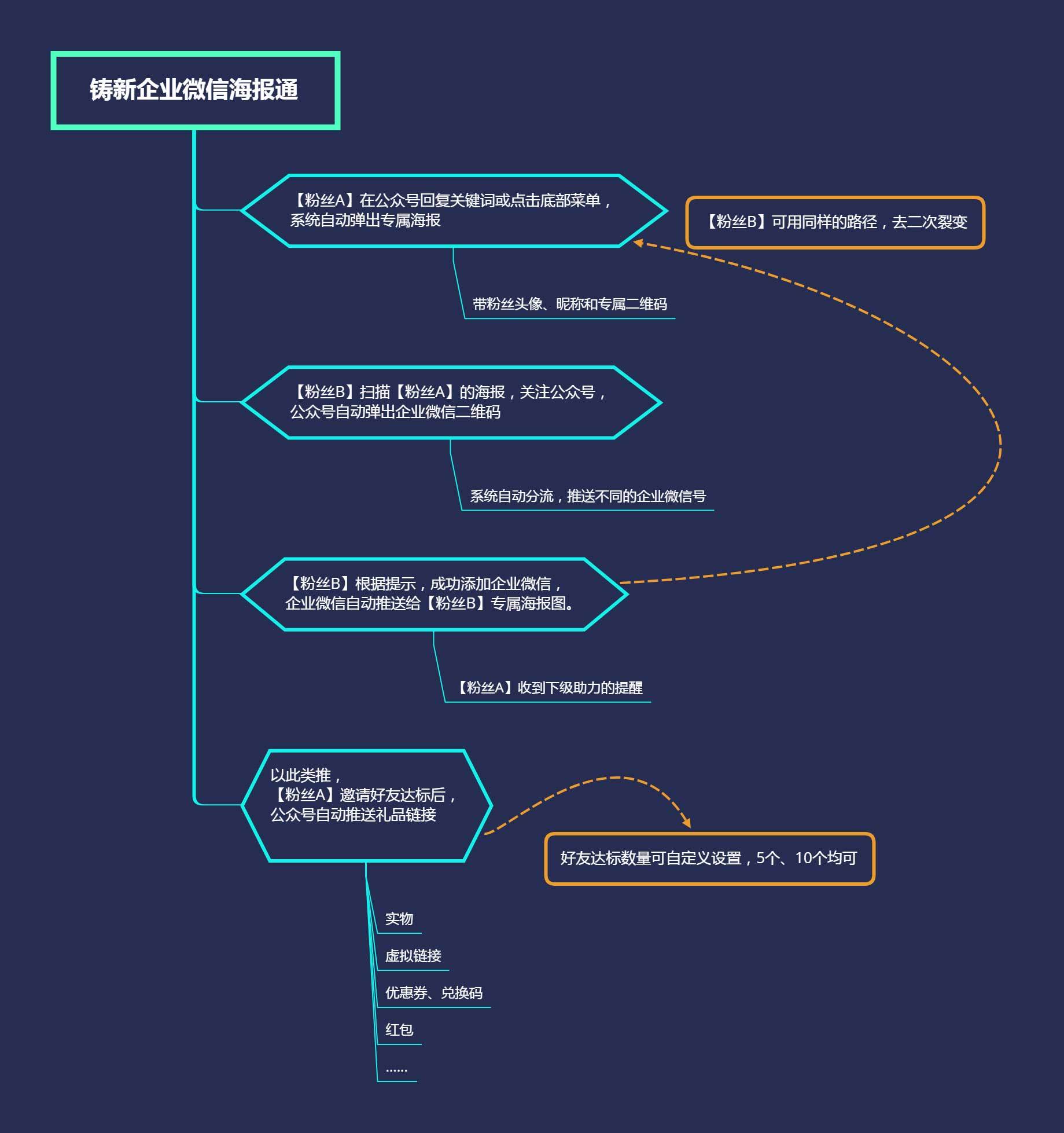 引导粉丝在公众号生成专属裂变海报,邀请下级关注并添加企业微信号,为自己助力获得相应的人气值,待人气值值达标后,即可获得礼品。